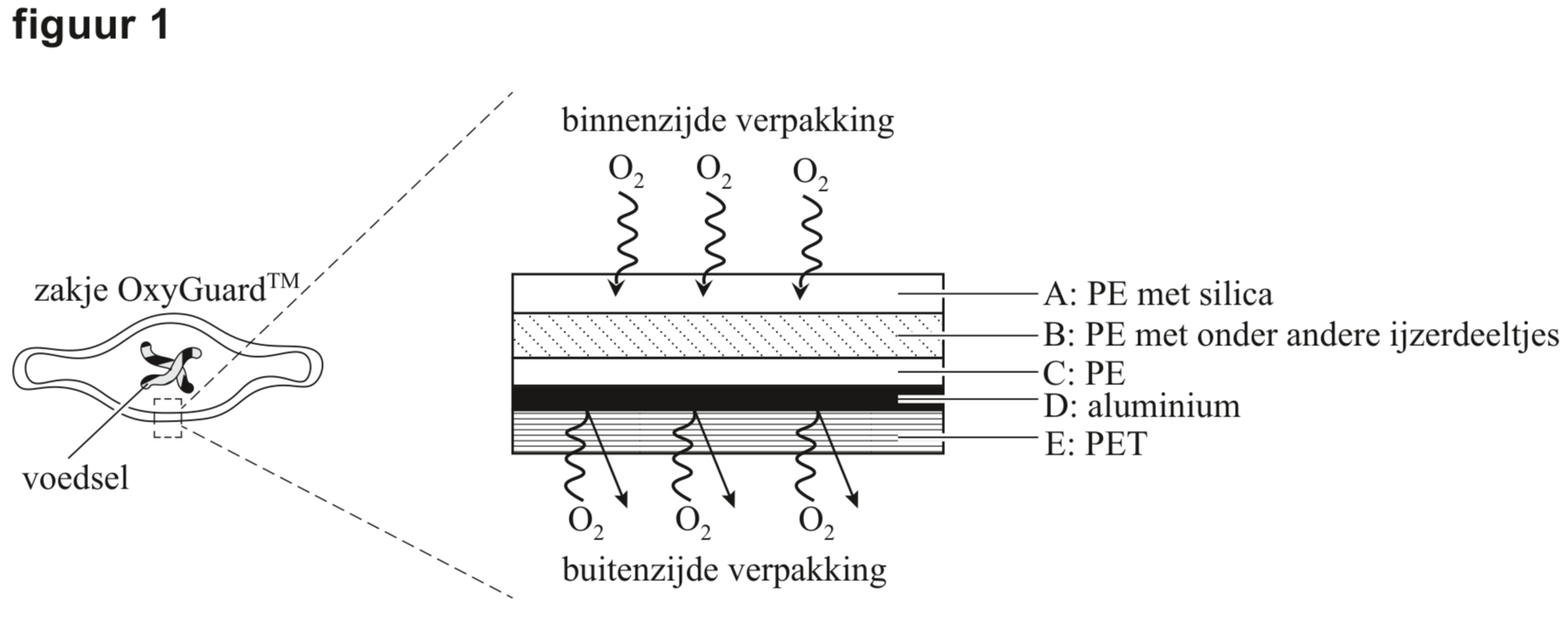 Om voorverpakt voedsel lange tijd te kunnen bewaren, is het belangrijk dat er zo weinig mogelijk zuurstof in de verpakking aanwezig is. Daarom is OxyGuard™ ontwikkeld: een verpakkingsmateriaal dat in staat is om zuurstof in de verpakking 'weg te vangen' en zuurstof buiten de verpakking erbuiten te houden. OxyGuard™ is opgebouwd uit verschillende lagen poly-etheen (PE), een laag aluminium en een laag poly-ethyleentereftalaat (PET). In figuur 1 is deze opbouw vereenvoudigd weergegeven.