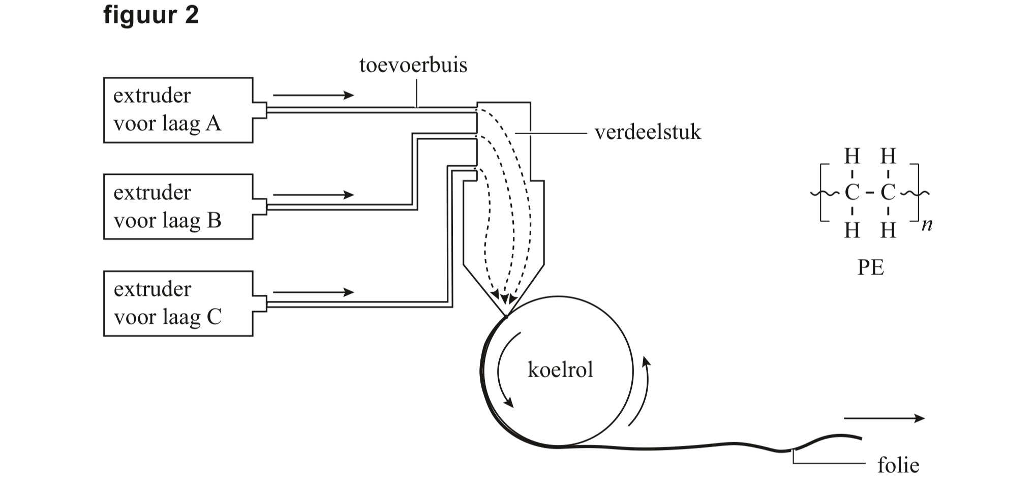 Laag A, B en C (figuur 1) zijn gemaakt van PE. Deze lagen van PE worden gemaakt door extruderen met drie extruders. Hierna volgt een proces waarbij de gesmolten lagen door een verdeelstuk gaan en er een folie ontstaat die uit drie lagen bestaat. Figuur 2 toont deze processen en de structuurformule van PE.